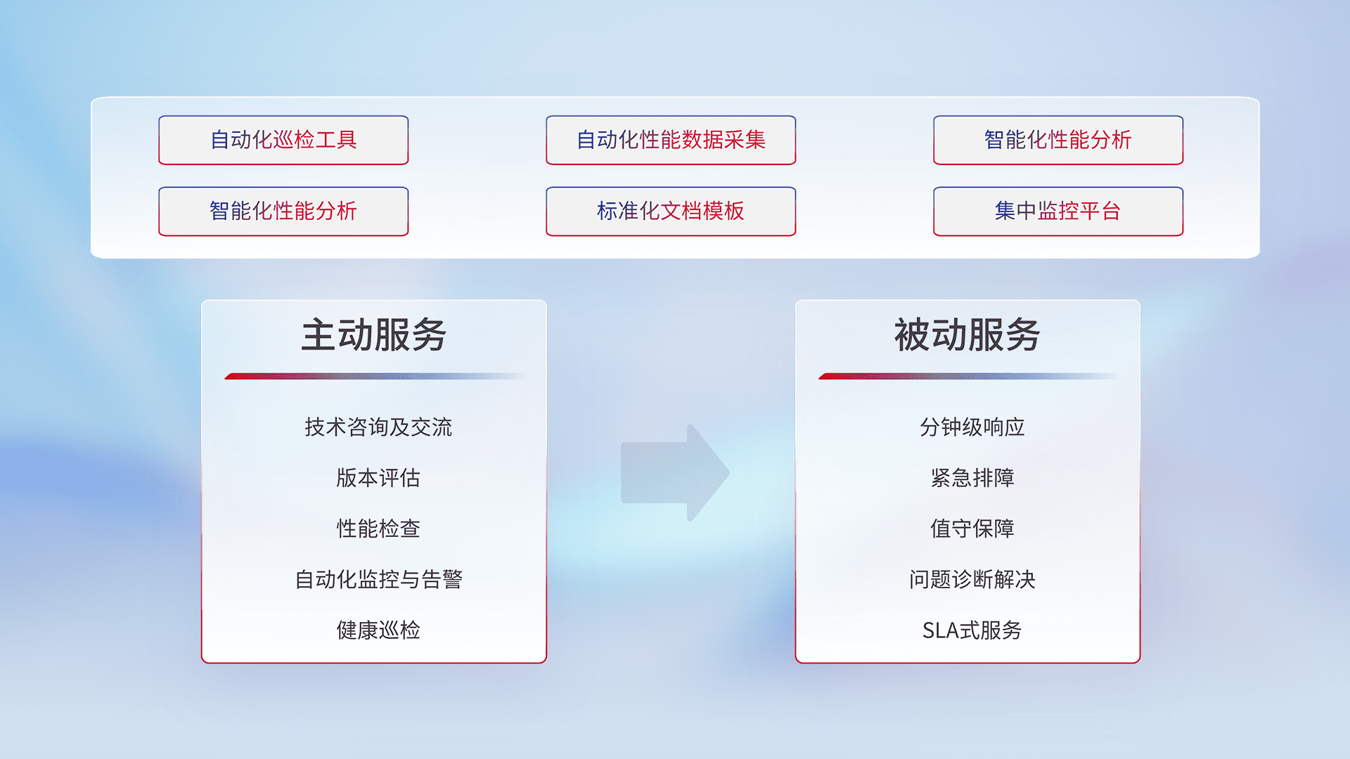 智能化工具和标准化文档,,,,保障服务质量,,提供主动服务(包含技术咨询、、版本评估、、、性能检查、、、自动化监控与告警、、、健康巡检)和被动服务包含(分钟级响应、、、、紧急排障、、值守保障、、问题诊断解决、、、、SLA服务)。。。